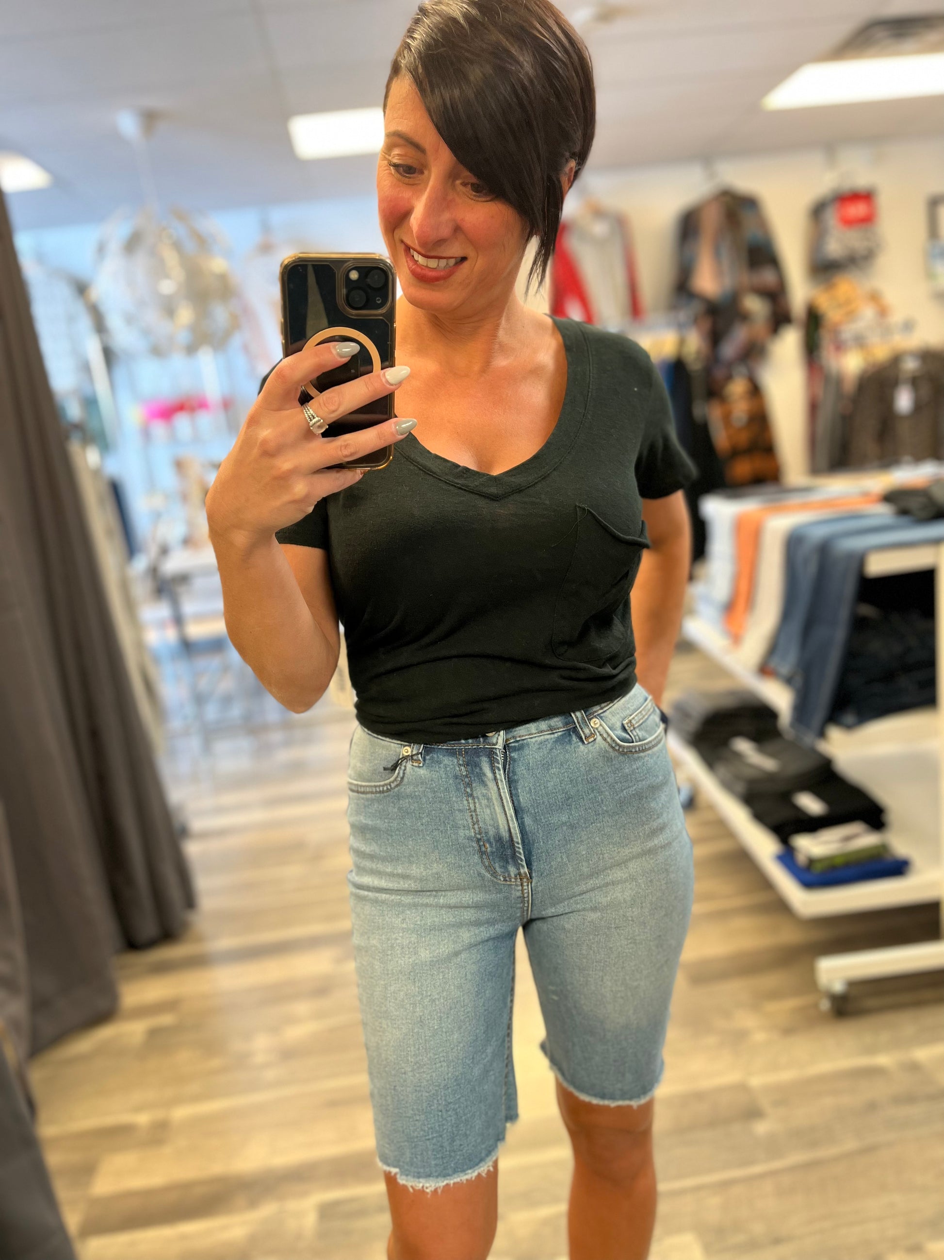 These adorable shorts are the perfect length! Raw edge hem gives it a little flare. Available in blue Wash and black Wash. Fit true to size. These shorts will not lose their shape.