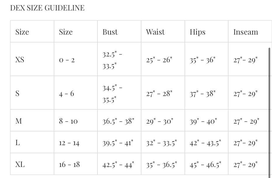 | XS | 0 - 2 | 32.5" - 33.5" | 25" - 26" | 35" - 36" | 27"- 29" |