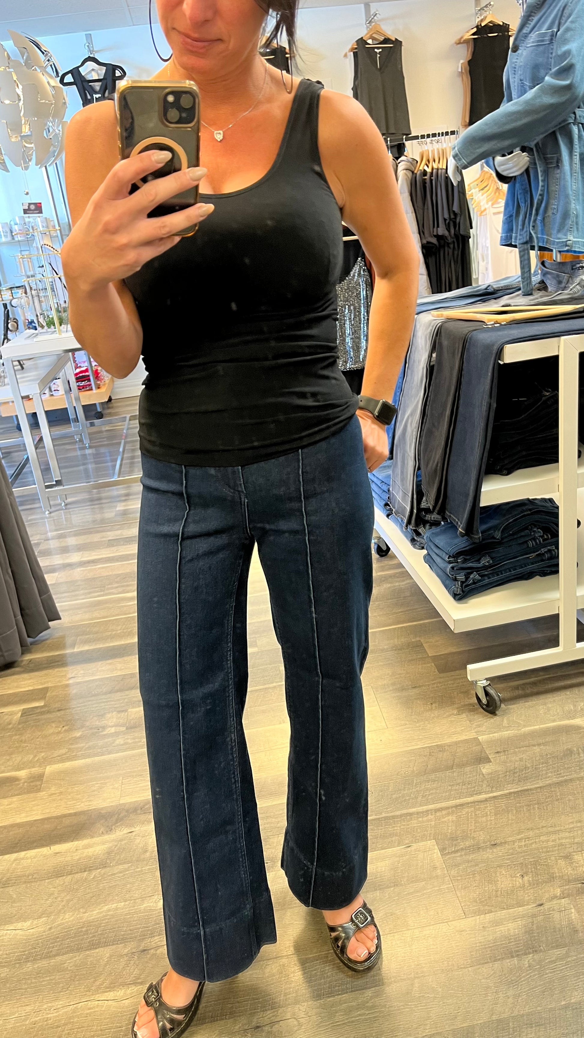 High rise. Dark indigo blue. Detailed hem on bottom. 71% cotton 25% polyester 3% rayon 1% spandex SKU: 2025260D