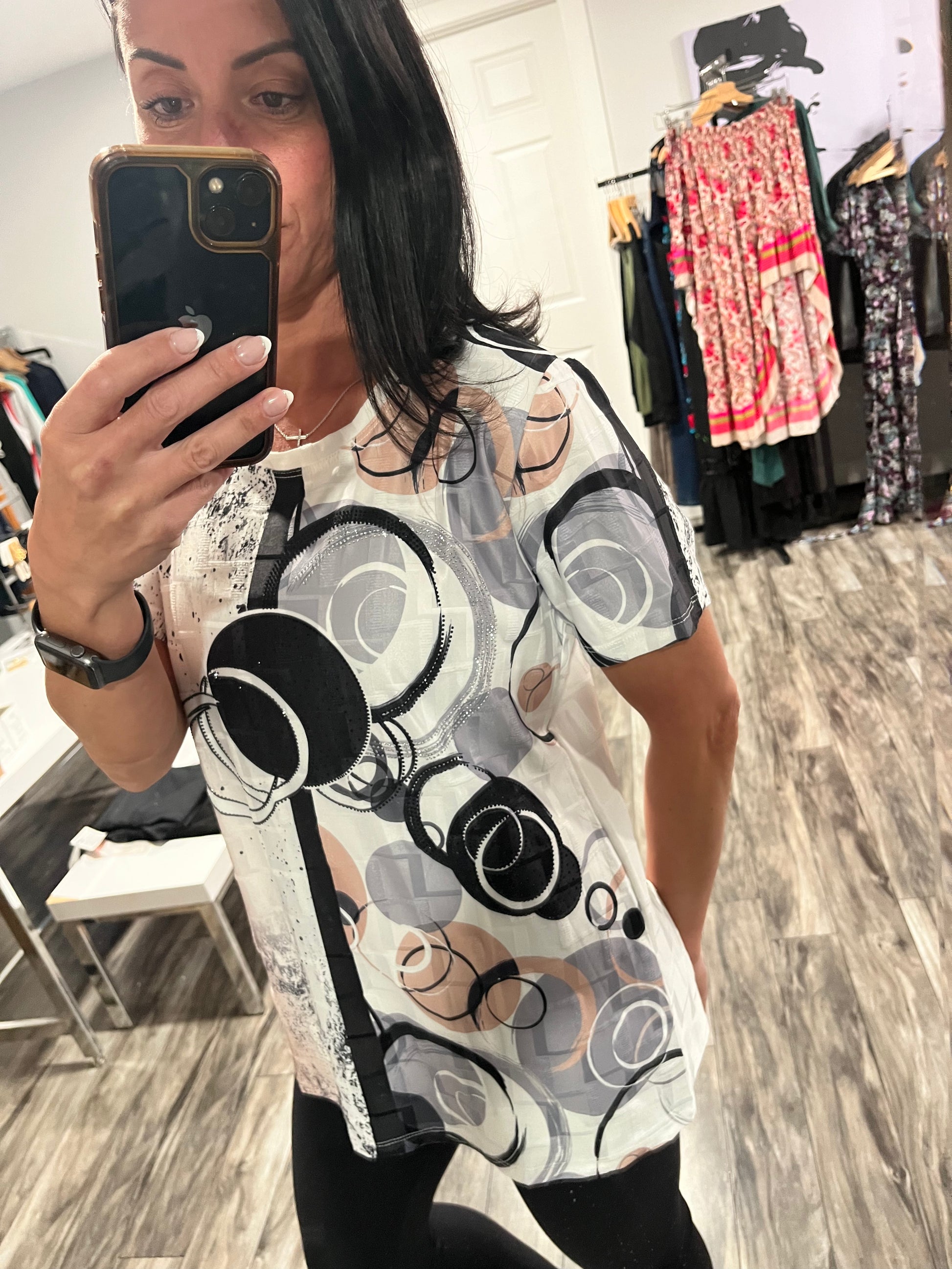 This is a stylish and modern women’s short-sleeve top, perfect for casual wear or dressing up with accessories. It features an eye-catching abstract print made up of overlapping circular patterns in black, blush pink, white, and gray tones, creating a dynamic yet balanced design. One side of the shirt is adorned with soft painterly textures and splatter effects for an artistic edge.